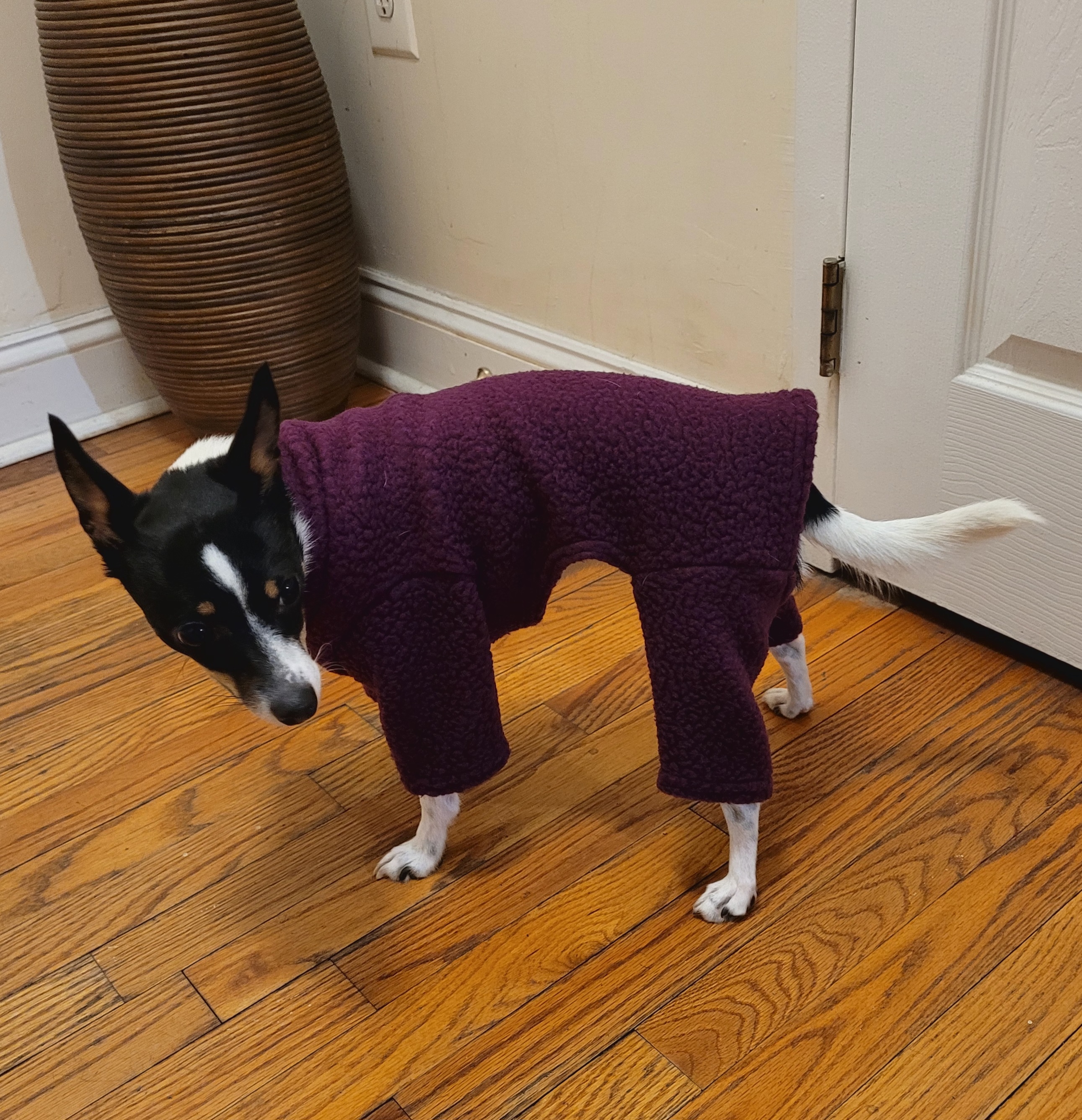 The Miniature Heavy Fleece Bodysuit is thick and warm, meant to wear outside in cold, windy, winter weather! It blocks wind, rain and snow and insulates the body. The form fitting bodysuit is designed for all activities- walking, running in the snow or going to the bathroom. It covers the full body, including the chest and legs. Your dog will not even realize it’s winter while wearing these suits!