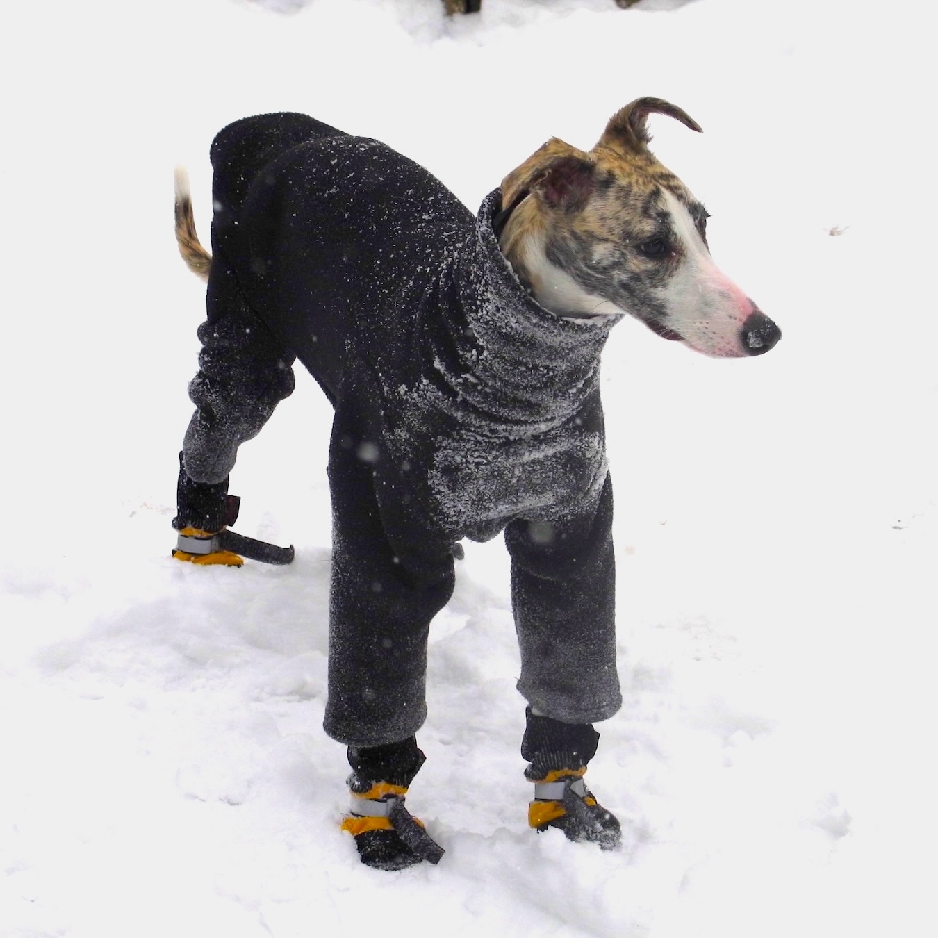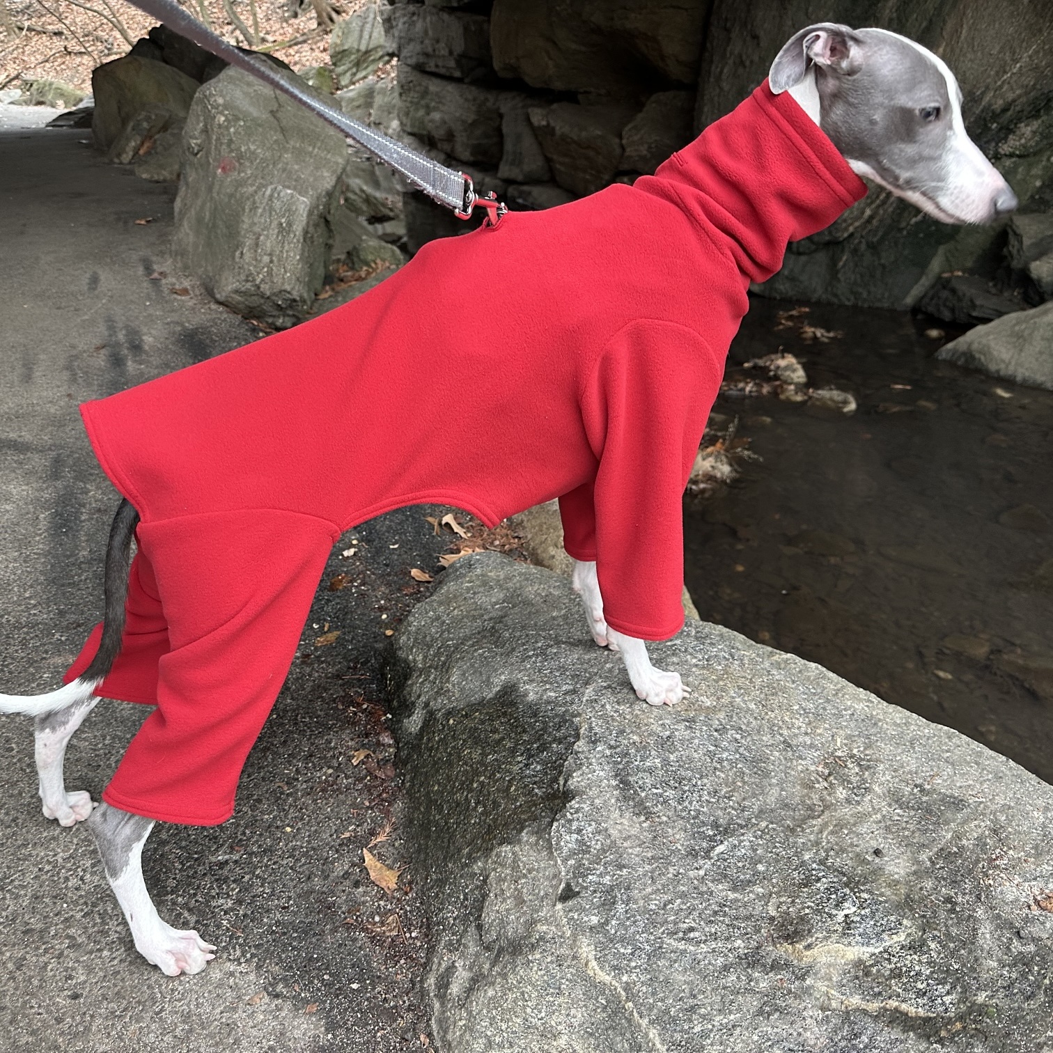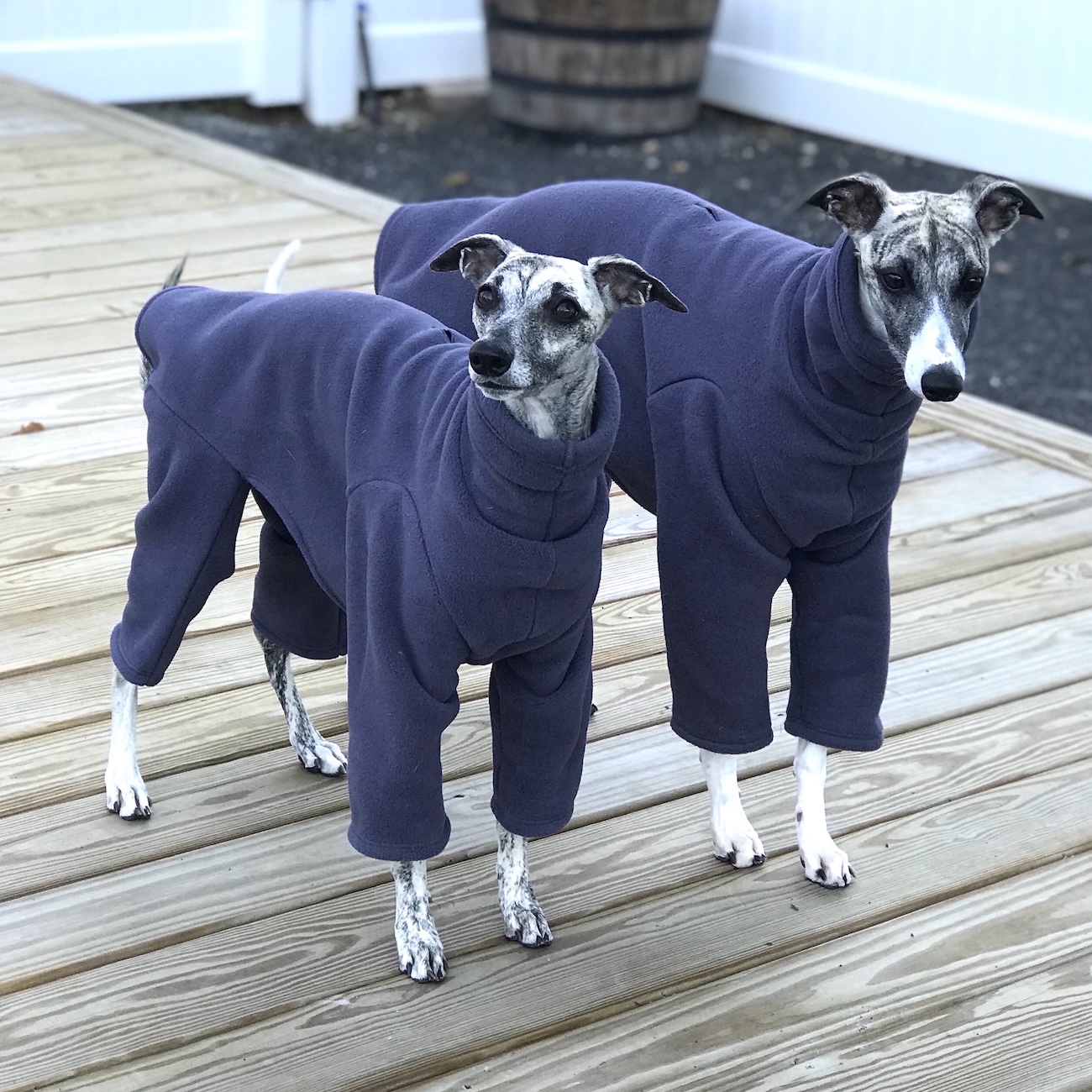 Whippet Heavy Fleece Bodysuits are thick and warm, meant to wear outside in cold, windy, winter weather! The form fitting bodysuit is designed for all activities- walking, running in the snow or going to the bathroom. It covers the full body, including the chest and legs. Your dog will not even realize it’s winter while wearing these suits!